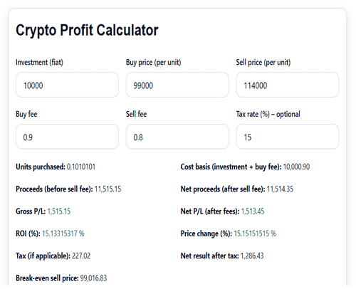 Instantly compute units, cost basis, net P/L, ROI, price change, optional tax, and breakeven for spot trades. Perfect for quick what-ifs and post-trade reviews. 👉 Open the Free Crypto Profit Calculator
